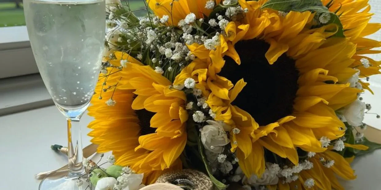 Sunflowers featured in the wedding party’s bouquets and decor. Shauna grew these in her garden and created the bouquets herself. She chose to incorporate a couple of potted rose trees and finished off the floral arrangements with a variety of silk and fabric flowers and garlands bought online.