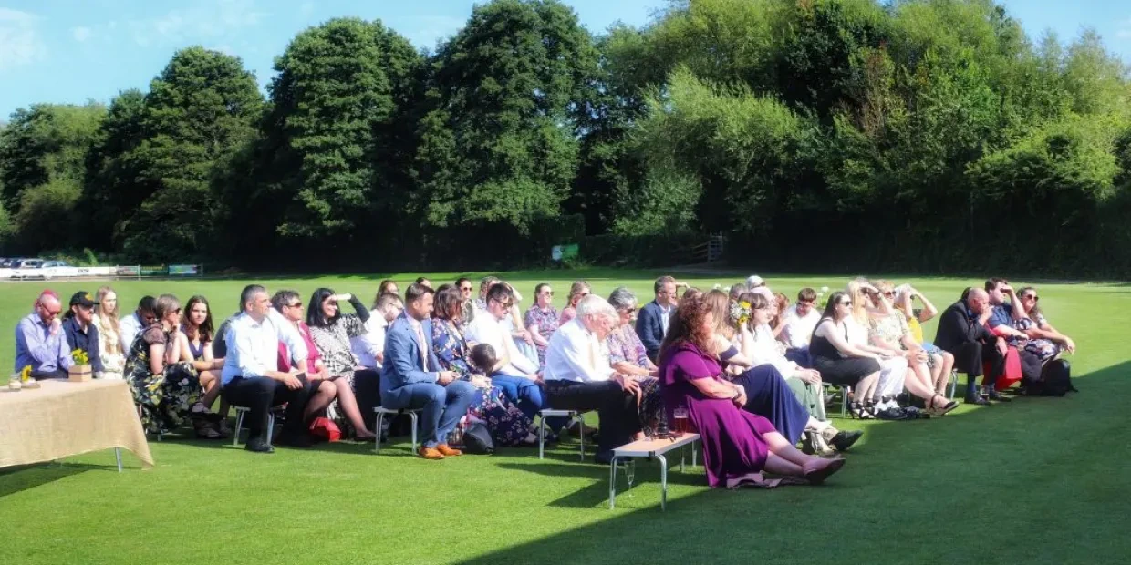 As a wedding celebrant based in Bristol, I have now worked with a few couples who have DIY’d significant parts of their wedding days. Shauna and Ian’s wedding took place at Stroud Cricket Club last August. The pavilion is just the most beautiful shade of grey-blue surrounded by a beautifully green pitch. Quite the striking combination on a vibrantly sunny August day and the perfect setting for an outdoor ceremony.