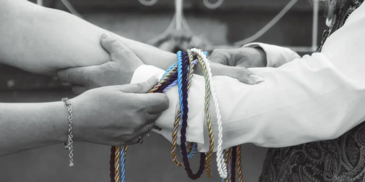 The ceremony incorporated a handfasting with individual cords. Shauna matched the colour of the cords to the decor and wedding party outfits.
